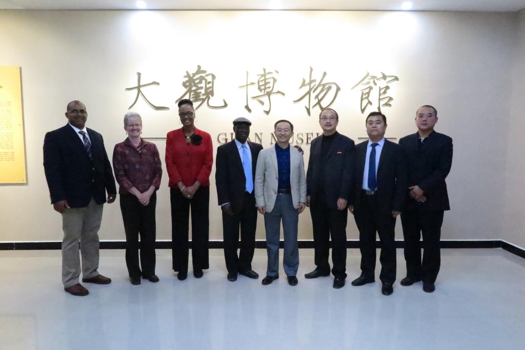 本站訊 10月19日下午,由美國威奇托市副市長珍妮特·米勒女士、威奇托市前議員拉沃娜塔·威廉姆斯等一行4人組成的友好代表團以及開封市外僑辦代表參觀了我校大觀博物館,開封大學副校長李治、藝術設計學院院長魏躍進陪同參觀。