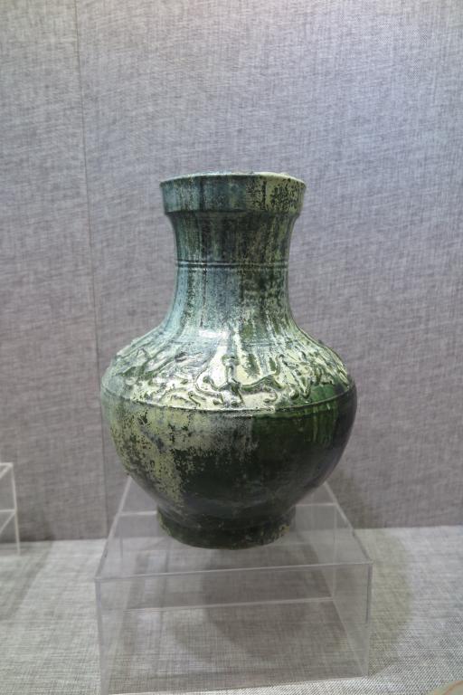 漢代綠釉屬于低溫鉛釉的一種類型。低溫鉛釉,是以鉛作為媒溶劑,以銅、鐵等作為著色劑,在泥胎上進(jìn)行施釉,燒制溫度約在700-800度左右。以銅作為顯色劑燒成后呈現(xiàn)出綠色,以鐵作為顯色劑燒成后呈現(xiàn)出黃褐色、棕紅色。低溫鉛釉是漢代工藝美術(shù)發(fā)展中的一種創(chuàng)造性技藝,代表了漢代制陶工藝發(fā)展的新成就。