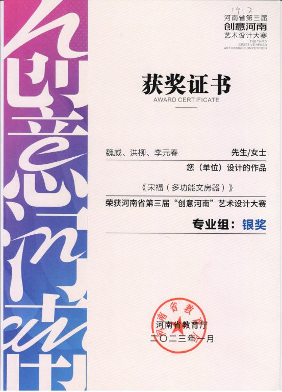 近日,從河南省教育廳官網(wǎng)獲悉,由開封大學大觀博物館、魏躍進示范性勞模創(chuàng)新工作室和宋代陶模研究所等機構推送的《宋福(多功能文房器)》參加河南省第三屆“創(chuàng)意河南”藝術設計大賽,經(jīng)專家評審并公示,榮獲專業(yè)組銀獎。