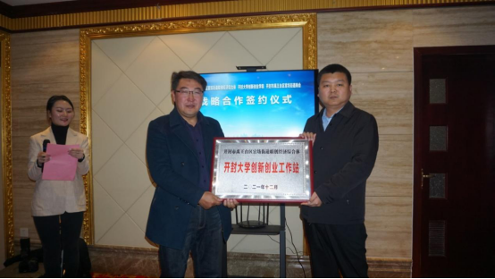 隨后,閆俊與李瑞杰、毛佳進行簽約;任明向周少東授予“開封市禹王臺區官坊街道聯創經濟綜合體——開封大學創新創業工作站”牌匾;閆俊向李峰授予“開封大學創新創業學院、開封市禹王臺區官坊街道聯創經濟綜合體——創新創業實踐基地”牌匾。