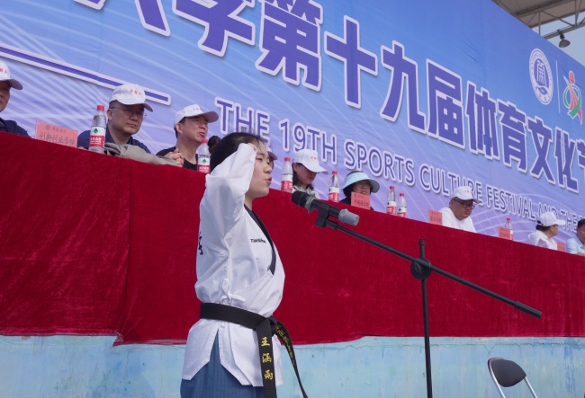 體育部教師、籃球國家一級裁判員陳志遠,第三十一屆世界大學生跆拳道項目夏季選拔賽(混雙第四名)、醫(yī)學部2020級王涵雨代表全體參賽裁判員、運動員宣誓。