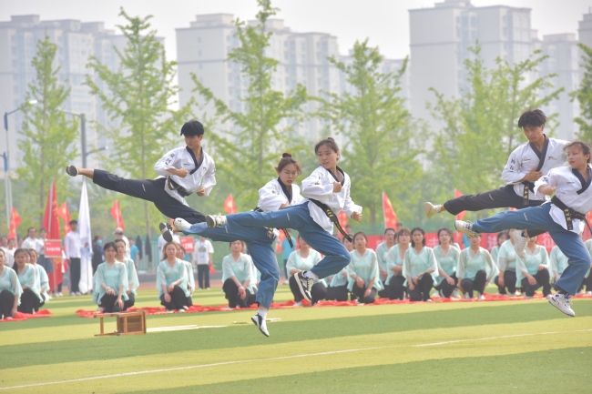 隨后,我校學生代表分別進行了跆拳舞表演和健美操表演,他們用朝氣蓬勃、青春洋溢的演出點燃了運動場上師生的激情。