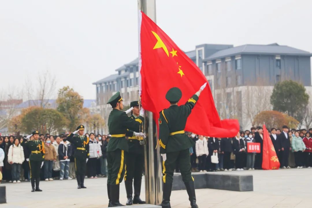 上午8時,國旗護衛隊從譚貞書記手中接過國旗。晨光熠熠,護旗手踏著鏗鏘步伐護衛國旗走向升旗臺,擎旗手揮臂揚旗,伴隨著雄壯的《義勇軍進行曲》,五星紅旗在師生的肅然注目下莊嚴升起。