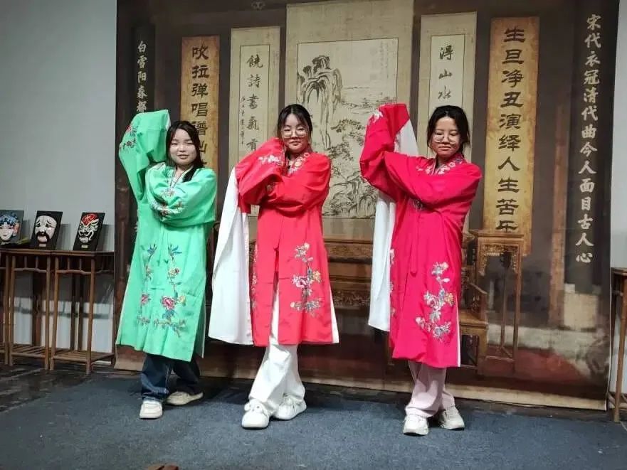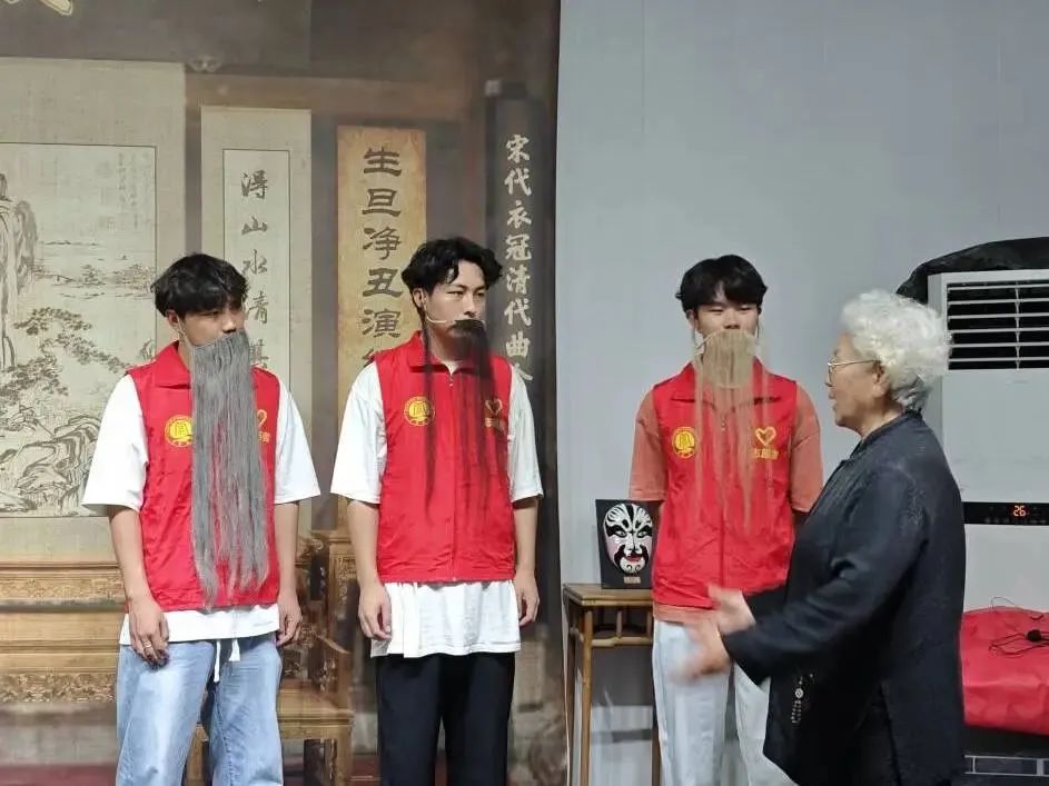 研學過程中,國家級非物質文化遺產二夾弦代表性傳承人田愛云,為小分隊的師生們詳細講解了二夾弦的歷史淵源、藝術特色、發展現狀,講述了她的演藝經歷,創辦二夾弦戲校的艱辛過程。隨后,田愛云為大家演唱了一段二夾弦的代表性曲目,表演了二夾弦不同角色的扮相,演示了二夾弦曲目的標志性動作。成員們戴上“口髯”、穿戴上戲服,學習表演動作,沉浸式感受二夾弦的文化魅力。