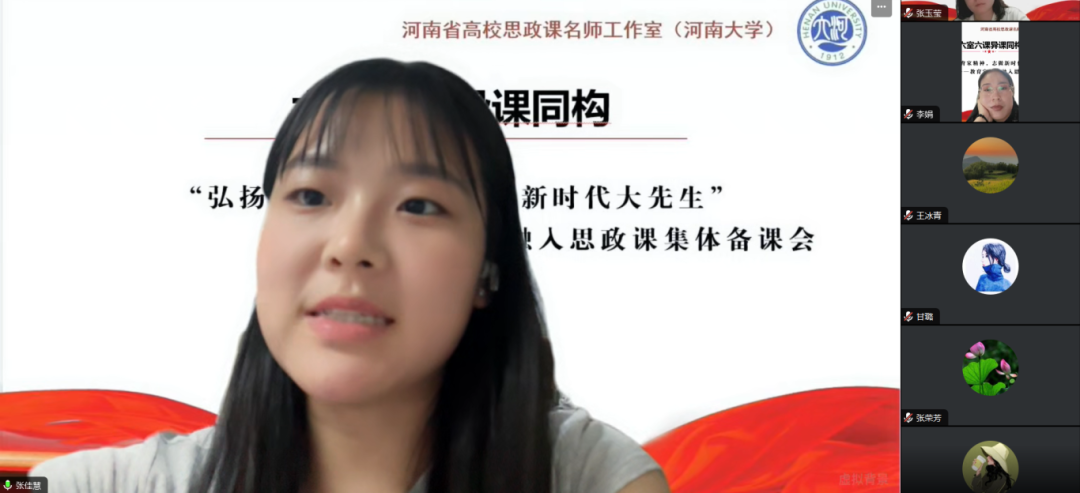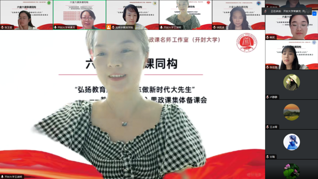 此次會議由河南省高校思政課名師常素芳工作室承辦。河南省高校思政課名師常素芳工作室負責人、開封大學黨委宣傳部部長常素芳主持會議。來自河南大學、河南農業大學、新鄉醫學院、黃淮學院、開封大學、河南機電職業學院6所高校的思政課名師工作室負責人、核心成員,以及思政課師生代表參加會議。