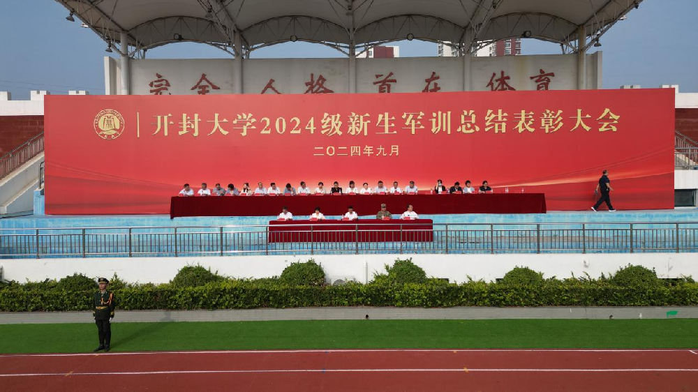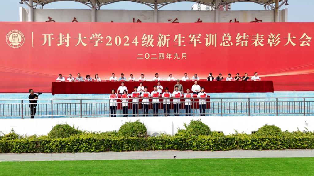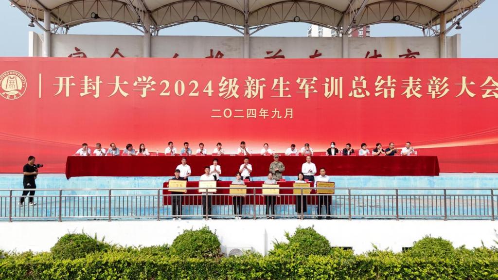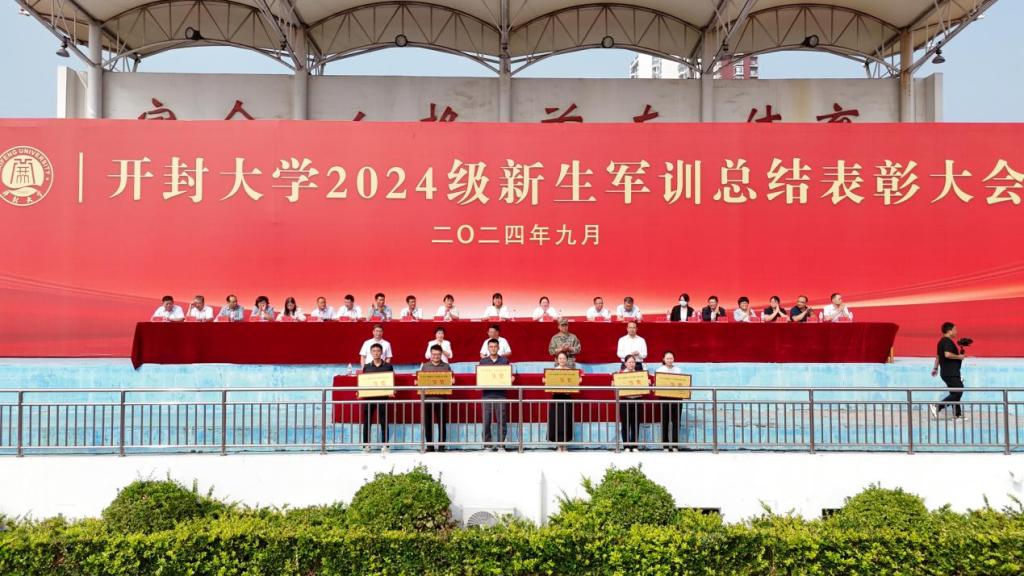 高校信息網9月22日訊 9月20日,開封大學2024級新生軍訓總結表彰大會在學校北操場隆重舉行。開封市龍亭區人民武裝部政委周峰,校領導萬是明、成芳、謝文忠、石超亭出席大會。大會由學校黨委委員、工會主席成芳主持。