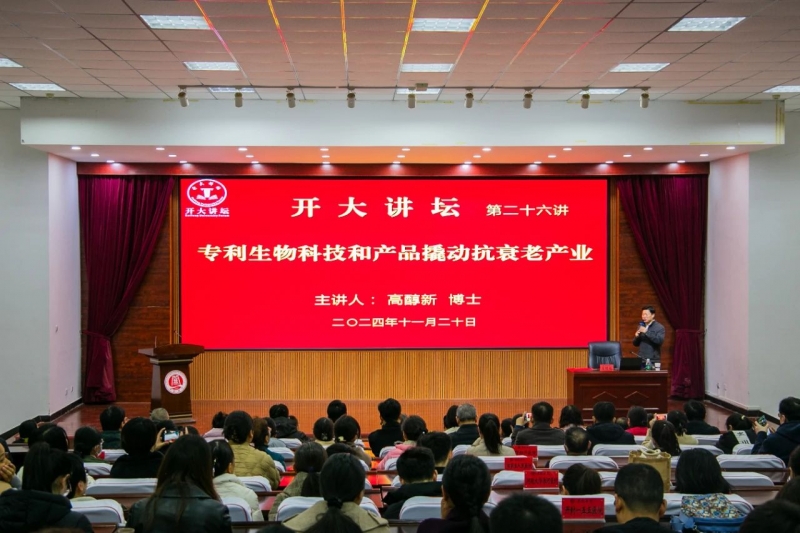 11月20日上午,開封大學醫學院名譽院長聘任儀式暨“開大講壇”系列報告會順利舉行。健科國際股份有限公司創辦人兼行政總裁高醇新博士作了題為《專利生物科技和產品撬動抗衰老產業》的專題報告。市衛健委黨組書記、主任劉建宏,開封大學黨委書記譚貞出席會議。會議由校長王德如主持。