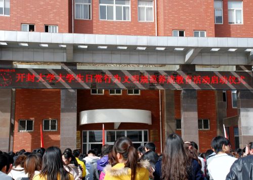 開(kāi)封大學(xué)副校長(zhǎng)萬(wàn)是明在致詞中說(shuō),為進(jìn)一步加強(qiáng)和改進(jìn)開(kāi)封大學(xué)大學(xué)生思想政治教育和日常管理工作,科學(xué)推進(jìn)我校德育工作,逐步建立大學(xué)生日常行為文明規(guī)范養(yǎng)成教育長(zhǎng)效機(jī)制,學(xué)校決定自本學(xué)期開(kāi)始,長(zhǎng)期開(kāi)展以“明德勵(lì)學(xué)知榮辱、篤行創(chuàng)新樹(shù)新風(fēng)”為主題的大學(xué)生日常行為文明規(guī)范養(yǎng)成教育活動(dòng),并希望通過(guò)養(yǎng)成教育主題活動(dòng)的長(zhǎng)期開(kāi)展,引導(dǎo)廣大青年學(xué)生自覺(jué)樹(shù)立當(dāng)代大學(xué)生的良好風(fēng)范和形象,切實(shí)做到“六講”、“六無(wú)”,力求達(dá)到待人接物,文明禮讓;儀容舉止,恰當(dāng)莊重;衣著打扮,樸素大方;男女交往,行為得體;崇尚節(jié)約,摒棄浪費(fèi);生活秩序,優(yōu)美和諧。